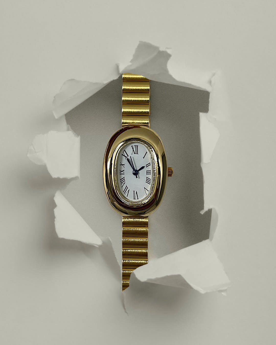 Narely fait la démonstration parfaite de la montre « Baignoire » , une forme ovale avec une signature intemporelle.