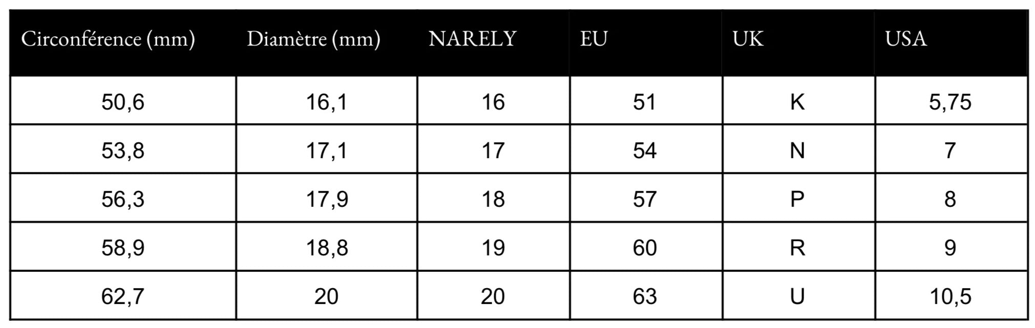 4. Utilisez le tableau ci-dessus pour déterminer la taille de votre bague.
