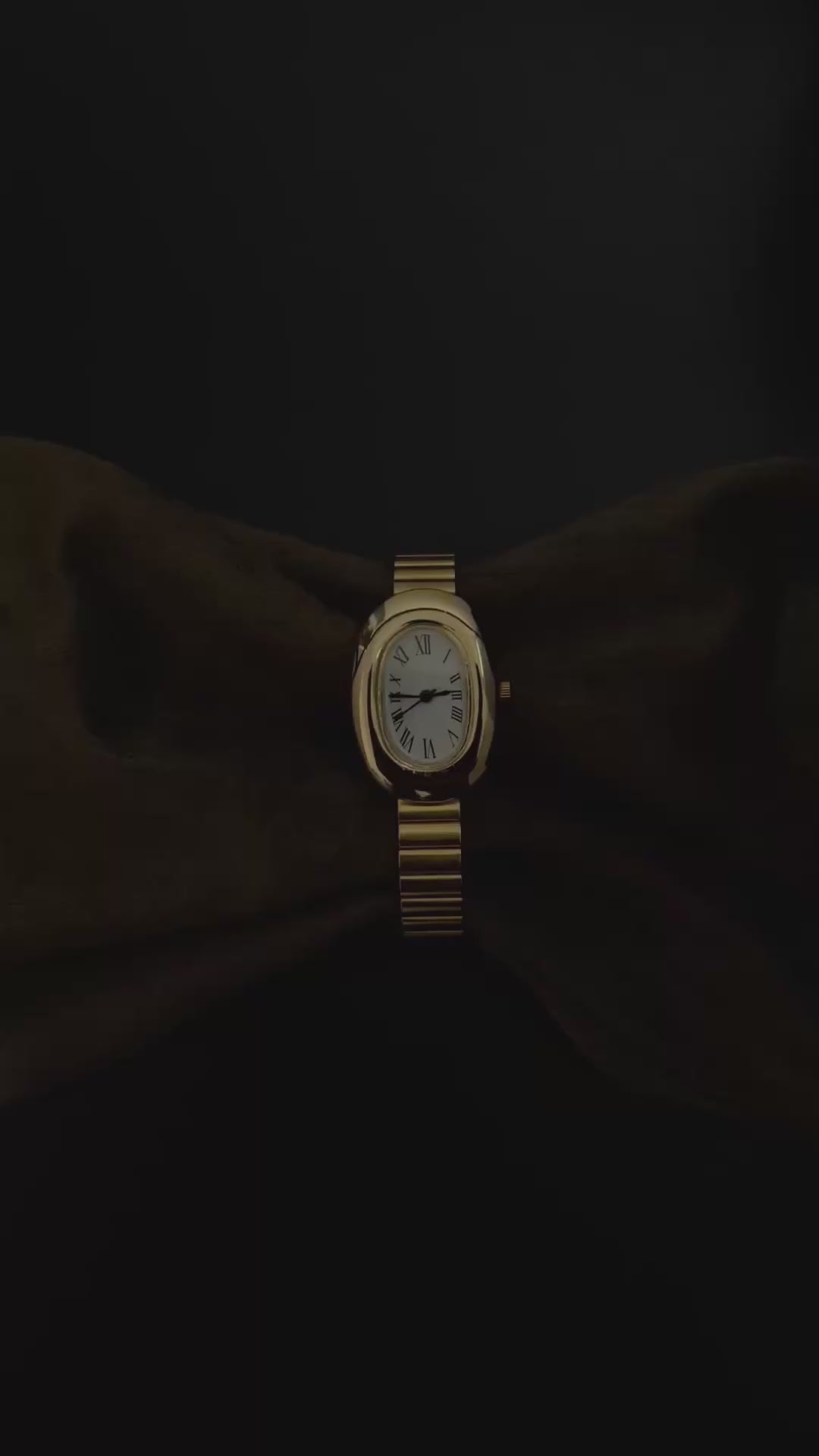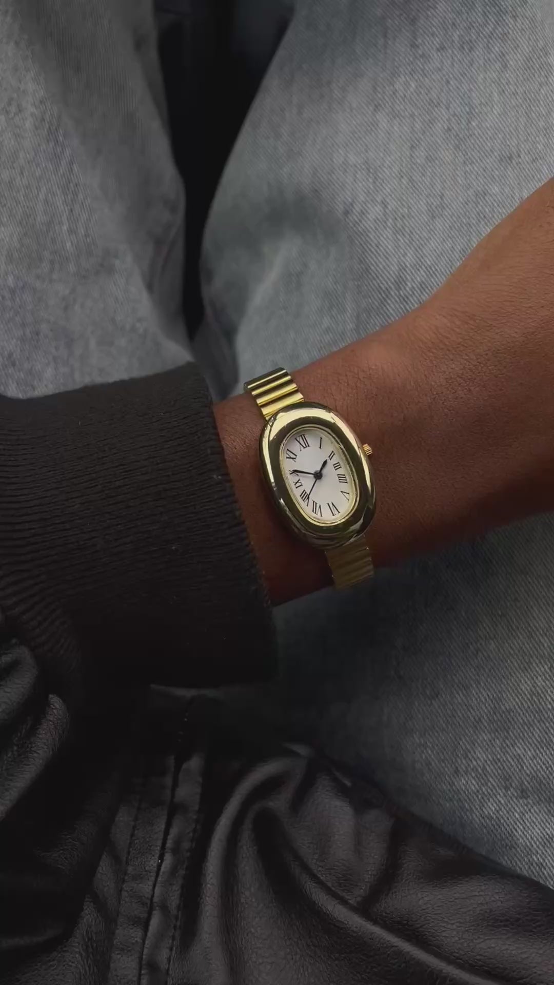 Fabriquée en acier inoxydable plaqué or 14 carats de qualité supérieure, elle se distingue par sa silhouette ovale audacieuse, son cadran à chiffres romains, et de son bracelet élégant à la fois classique et moderne.